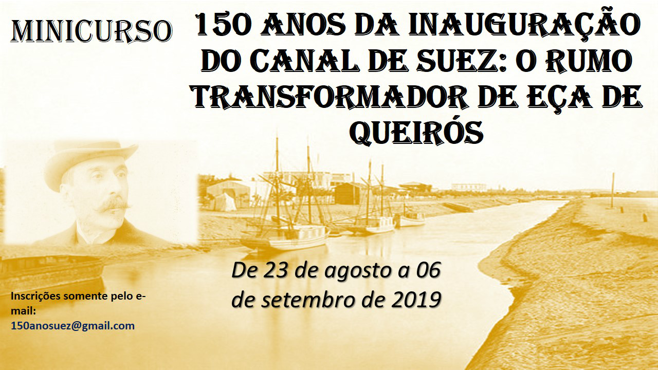 Continuam abertas as inscrições para o minicurso "150 anos da inauguração do Canal de Suez: o rumo transformador de Eça de Queirós", a ser realizado nos dias 23 e 30 de agosto e 6 de setembro, das 9h30min às 11h, no Campus do Benfica. O evento tem o objetivo de resgatar a participação do escritor, jornalista e advogado português no episódio da inauguração do Canal de Suez e de ressaltar o impacto do fato no âmbito jornalístico e literário de Eça.