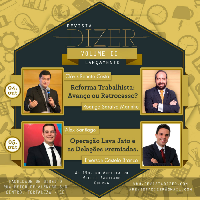 A Revista Dizer, periódico eletrônico da Faculdade de Direito da Universidade Federal do Ceará, lançará seu segundo volume promovendo evento gratuito nos dias 4 e 5 de outubro, sempre às 19h, no anfiteatro Willis Santiago Guerra, daquela unidade acadêmica (Rua Meton de Alencar, s/n, Centro). Haverá debates sobre temas importantes, atuais e polêmicos, como reforma trabalhista e delações premiadas.