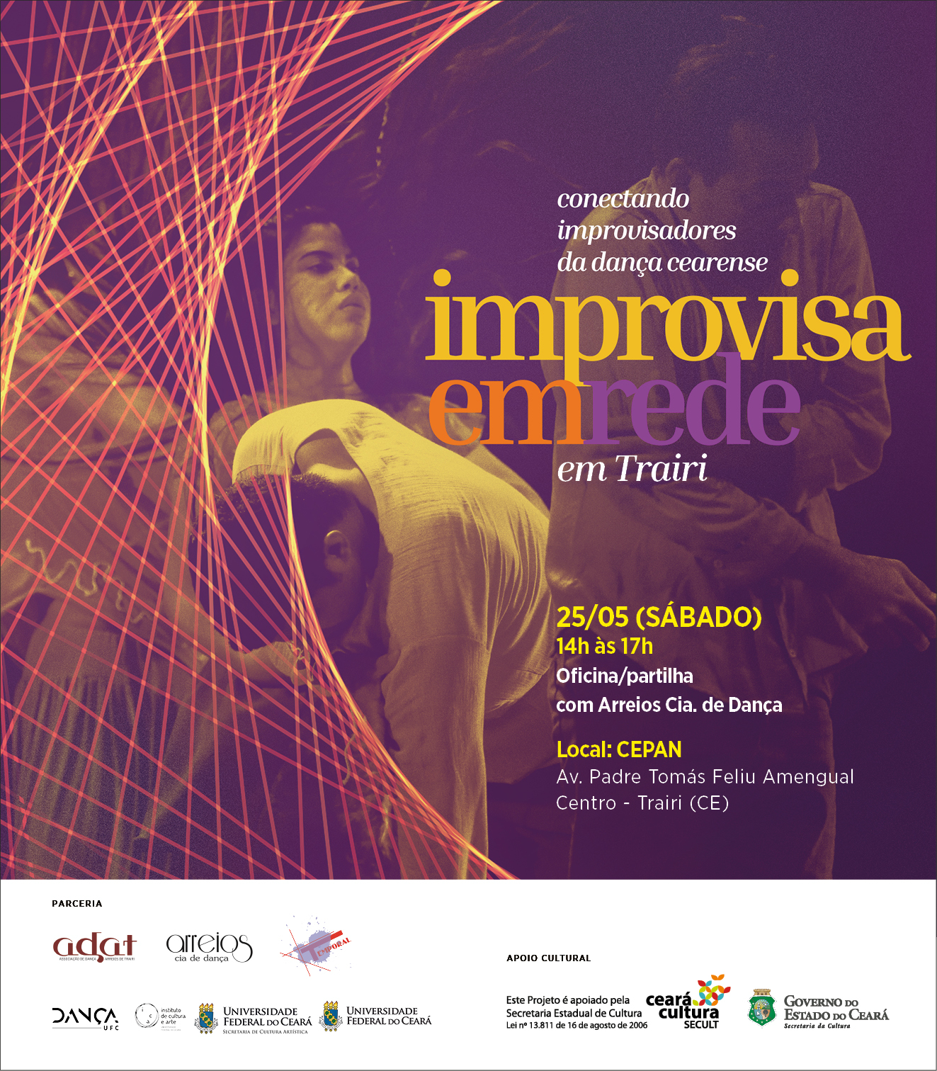 CONEXÃO – Apoiada pela Secretaria da Cultura do Estado do Ceará (SECULT), via XI Edital de Incentivo às Artes, a plataforma Improvisa em Rede busca desenvolver elos entre improvisadores da dança cearense. O projeto já passou pelas cidades de Sobral e Itapipoca. A primeira fase de atividades será encerrada em Fortaleza.